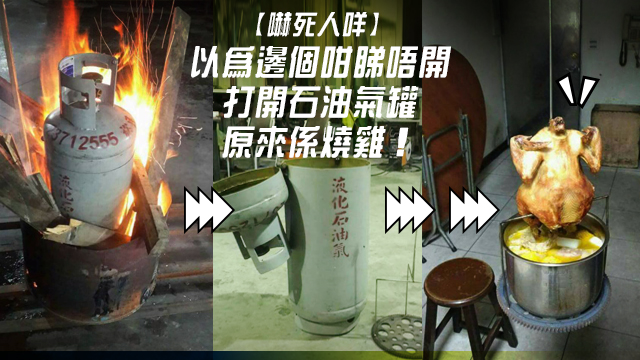 原來網友個fd改造咗個石油氣罐,仲整多咗個架,可以插住大大隻雞嚟燒。放入去個罐入面燒,唔止可以留返啲雞汁煮嘢~ 又唔怕個表面畀火燒焦變咗燒粟米咁橋,真係好聰明呀~唔知燒乳豬得唔得呢?嗱,以上呢啲危險動作,係受過專人訓練㗎,家庭觀眾唔好亂學呀,唔係成班人去BBQ,畀慈母以為你恐怖襲擊就唔好啦係咪?