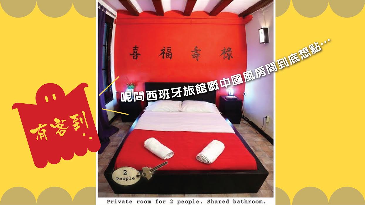 其實唔少外國人都好鍾意東方style㗎,所以西班牙有間旅館就整咗間中國風嘅房喇,明明去西班牙但又可以扮晒去咗中國,又幾抵玩啵!話明中國風,紅噹噹就唔少得啦,床頭幅牆仲要用毛筆寫住「喜、福、壽、祿」,真係好有feel呀!