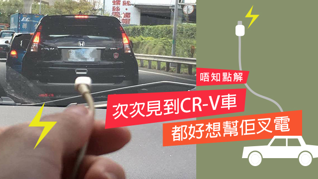 話說,最近有台灣網民就喺facebook post咗張相,佢話自己次次喺街見到CR-V都好想拎條叉電線出嚟幫架CR-V叉電,因為佢覺得CR-V車尾個凹位真係好似插頭位喎。嘩,唔post由自可,一post就發現原來好多網民都好有同感,呢位網民張相就係咁喺一日之內呃咗三萬幾個like喇!