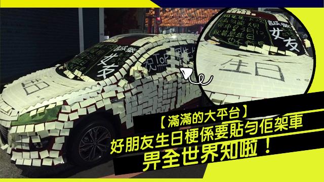 嘩~係滿滿嘅祝福呀~壽星嘅老友為咗畀個實派佢,竟然用Memo紙黐滿佢架車,仲要大大隻字寫住生日?!真係「讓全世界也知道壽星幾低調」呀!壽星見到一定開心到喊出嚟啦!