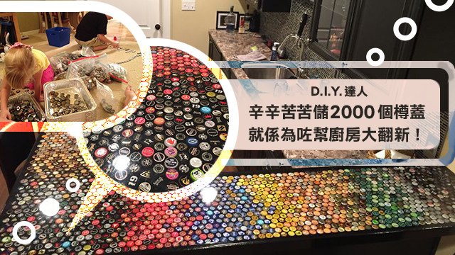 但係儲埋咁多樽蓋做咩先~唔通老竇細個儲開蓋掩,想將呢樣男人嘅浪漫傳畀仔女?原來係用嚟裝修廚房呀!仲搵埋阿仔阿女幫手分類?,記得睇手呀,啲蓋邊都幾利㗎下~