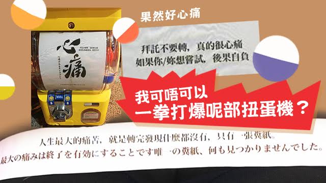話口未完,街頭就有部扭蛋機挑戰你嘅忍耐力喇!睇下先,上面雞乸咁大隻字寫住「心痛」,隔籬仲有細細行句子寫住「拜託不要轉,真的很心痛,如果你/妳想嘗試,後果自負」?,扮咩吖,睇死你入面咪又唔係唔同sad樣嘅公仔!