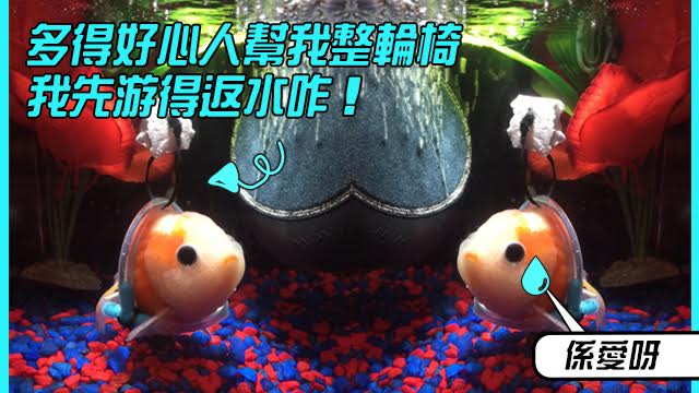 好彩,有個好心哥哥Derek見佢咁慘慘,幫佢整咗個金魚專用輪椅!其實之前都試過有人用木塞整「魚堅尼」畀金魚仔㗎喇,而今次嘅好心人,就用發泡膠同埋膠管整喇。條膠管喺下面輕輕托住金魚仔,最頂就綁住一粒發泡膠,幫金魚仔平衡身體同埋浮起,佢而家終於可以自由自在咁游水水喇~
