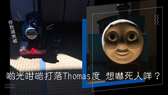 X!嚇死人咩,嚇到個心都離一離呀,邊L個放架Thomas火車喺度呀!仲要咁啱喺陰暗嘅廳度有一道光由上而下打斜咁射喺佢塊面度,笑到人寒都心埋,想點啫你!