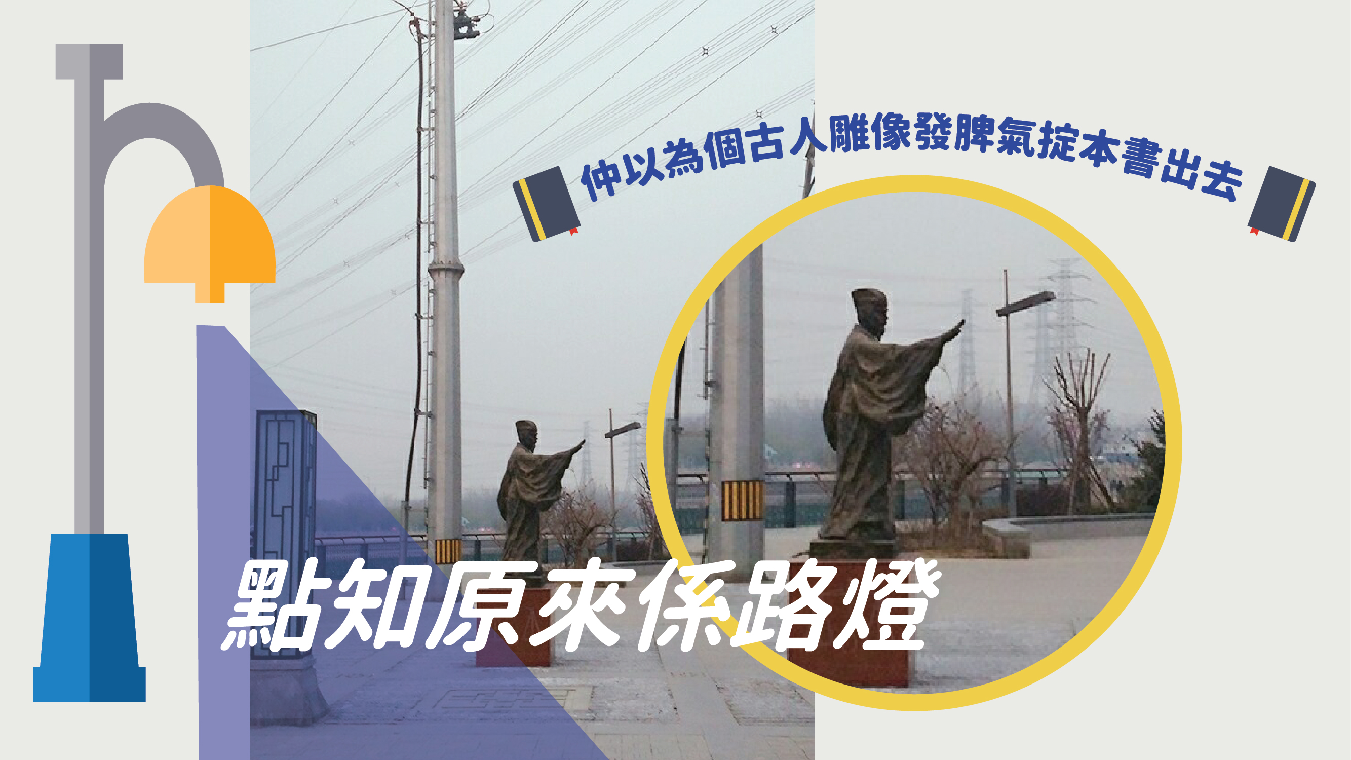 喂喂,好心大家咪咁多幻想住先啦!睇真啲,個古人雕像唔係掟緊本書出去,本書只係街燈嚟㗎咋!