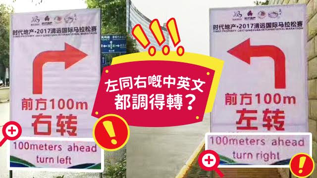 國家要放開,思想要放開,強國而家咁強,唔少洋鬼子都慕名嚟到參與呢場體育盛事㗎。話明係大大規模馬拉松比賽,指示牌當然都要面向國際,中英對照啦。跑馬拉松最緊要識睇指示牌,唔好跑錯方向,「右轉」個牌就寫住「turn left」,「左轉」個牌就寫住「turn right」喇,唔好係話錯嘅,只係有強國特色啫。