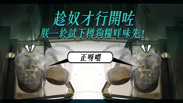 「哼,呢樽就係狗糧喇?餵嗰隻蠢狗餵得咁爽吖嗱?等朕一於試下咩味先!咦……都唔好食嘅喵,不過朕唔鍾意嘅嘢,都冇人可以得到,而家成樽都係朕高貴嘅貓毛,當益你啦狗仔!」