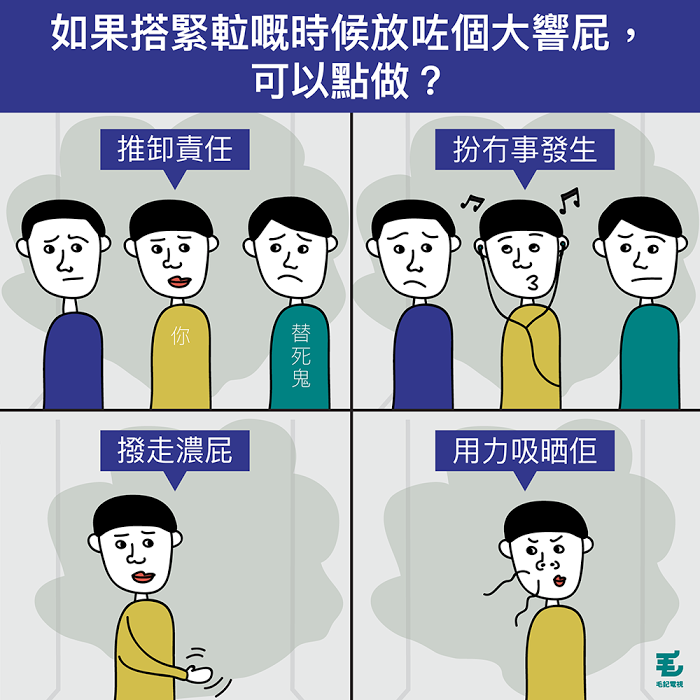 成日話女神唔放屁,傻豬嚟嘅,你估佢真係神咩,唔講你唔知呀,原來正常人平均一日會放成14個屁咁多㗎!冇人嘅時候放都還好呀,聞下自己啲屁仲不知幾有安全感?,最驚就係喺一個靜嚶嚶嘅封閉空間,例如搭?嗰時,突然呠一聲,劃破寧靜吖嘛……