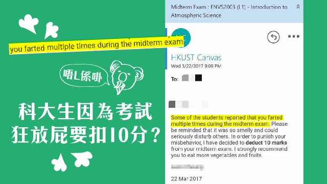 噚日就有個科大同學仔話自己收到Email,話有其他同學投訴佢之前喺考Midterm嗰時狂放屁,唔止臭親人,仲嚴重影響到其他同學,所以要扣佢10分喎!消化唔好已經夠慘啦,仲要扣分,唔通老師驚佢用屁聲嚟做摩斯密碼出貓咩?