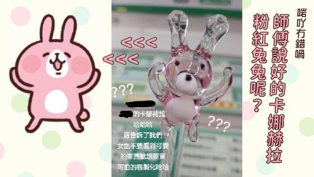 台灣呢位網友就好鍾意呢排好hit嘅卡娜赫拉插圖隻成日恰9隻雞仔嘅粉紅兔兔,咁啱又見到學校有師傅擺檔吹玻璃,仲話可以自訂要咩公仔,梗係要捧下場啦!