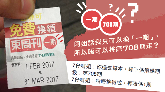 原來7仔阿姐係因為見到張券上面寫住可以免費換領東周刊「一期」,而唔係「第708期」,所以就死都唔肯畀本第708期嘅《東周刊》佢。阿姐表示,想換第708期嘅《東周刊》?拎張寫住可以免費換領「東周刊第708期」嘅券嚟先講啦唔該!