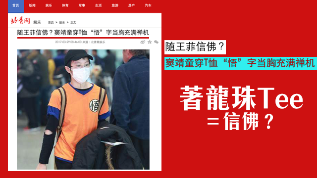 話說最近有網民喺網上見到好幾個強國媒體都以「随王菲信佛?窦靖童穿T恤“悟”字当胸充满禅机」為題,報導竇靖童現身北京機場嘅消息。內容指竇靖童著住一件印有「悟」字嘅Tee,疑似係受阿媽嘅影響,所以對佛語情有獨鍾咁話喎!