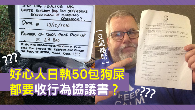 咪以為好人實有好報,有啲狗主覺得佢多管閒事,仲寫信恐嚇佢?呀!最慘嘅係連政府都出咗張良好行為協議(Acceptable Behaviour Contract )要佢收手唔好再做呀⋯⋯好彩有團體睇唔過眼,發起聯署幫佢咋!希望真係幫到Steven叔啦⋯⋯Btw,如果喺香港執,唔知有幾多真係狗屎呢下?