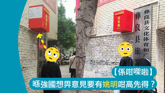 咦?說好的意見箱呢?同胞,岳高個頭睇睇~意見箱喺你頭頂呀!真係冇姚明咁高都放唔入啲意見呀!