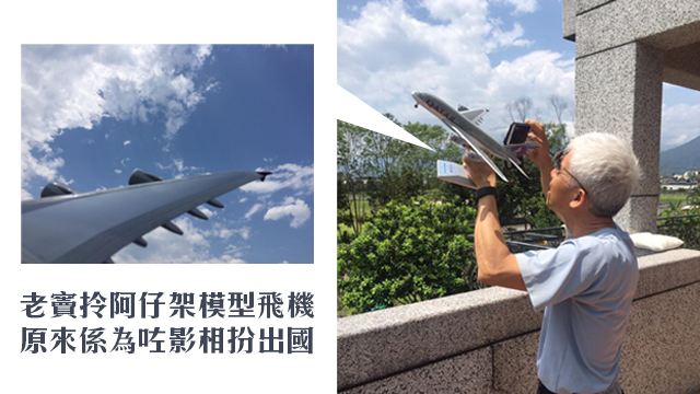 話說,最近有台灣網民話阿爸突然拎咗佢架模型飛機去⋯⋯喂,乜阿爸你都鍾意玩模型飛機㗎咩?原來阿爸無啦啦拎咗阿仔架模型飛機唔係要嚟玩,佢係借架模型飛機嚟影相,扮自己搭緊飛機,然後send去group度同fd子講佢有得去出國去旅行呀!