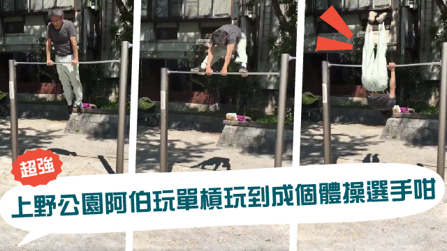 另外,呢位阿伯平時除咗會玩下單槓之外,有時佢仲會綁塊布喺條槓上面用嚟做其他動作,訓練下唔同嘅肌肉咁嘅~唔止咁,有時呢位阿伯仲會喺長櫈上面做倒立?!大家睇下佢幾堅~