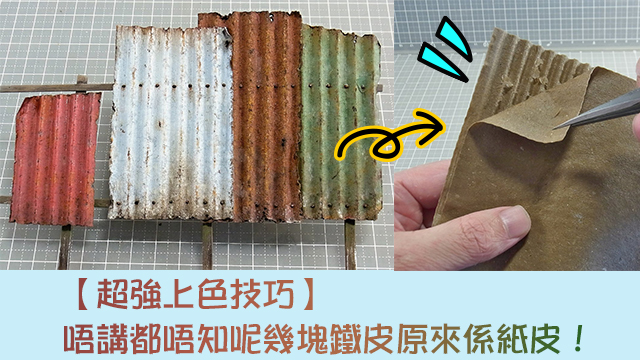 大家睇下,只要將塊紙皮整濕,然後再慢慢搣開佢,咁樣咪已經有個好靚仔嘅波紋形狀囉?跟住大家再用模型專用嘅顏料幫塊紙皮上色,一塊唔拎上手都唔知佢係用紙皮整嘅模型鐵皮咁就出咗世喇!要整模型鐵皮真係話都冇咁易呀⋯⋯