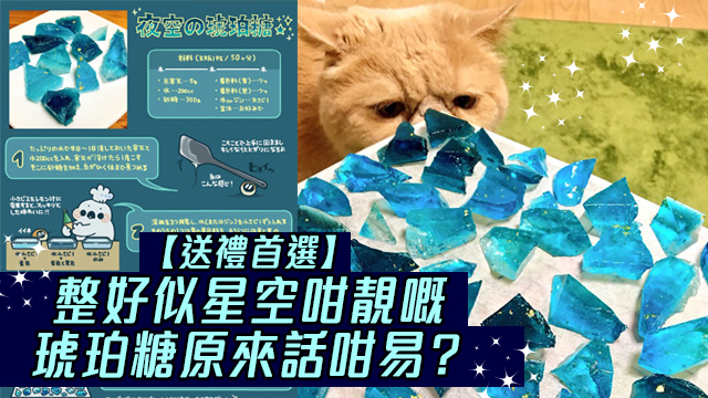 金箔就隨個人喜好加,睇下你想個夜空多唔多星星啦~雪硬咗再切成一塊塊就變成靚靚嘅夜空琥珀糖喇,真係又靚又Sweet,連主子都畀啲糖吸引住呀!