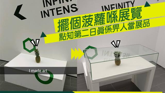 點知,第二日佢返去睇下有咩成果嘅時候,就見到個菠蘿畀人珍人重之咁擺咗入個玻璃箱度喇!照計可以搵到玻璃箱保護展品嘅,都係展覽搞手吖,又點解會連佢哋都當正個野生菠蘿係展品㗎呢……藝術嘅嘢,真係睇唔透。