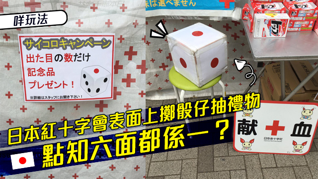 送禮呢家嘢唔止喺香港先work㗎,喺其他國家都一樣得啫!最近有位日本網友就見到紅十字會搞咗個攤位做宣傳,話擲骰仔擲中特別點數就有嘢送喎~咁著數?有冇咁大隻蛤乸隨街跳呀!等毛毛呢個骰魔會一會你先!