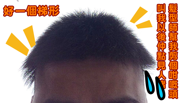 咦喂,做咩啲頭髮成個梯形咁嘅?雖則呢位網民話剪呢個頭都只係需要1000円,喺日本嚟講算係幾平啫,但阿髮型師你都唔使剪到佢個頭咁呀?你哋話嘞,呢位網民剪完個咁7嘅梯形頭之後仲點溝女?仲點面對自己啫?唉,今次真係唔使問都知呢位網民嘅心理陰影面積係上底加下底乘高除以二喇⋯⋯