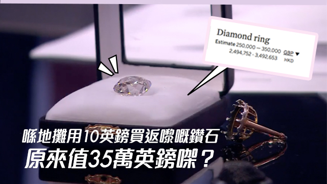話說,倫敦一間叫「Sotheby's」嘅拍賣行嚟緊7月會拍賣一批珠寶,而其中一隻價值35萬英鎊嘅26卡鑽石戒指竟然係物主當年用10英鎊買返嚟嘅?嘩嘩嘩,乜原來呢個世界真係有咁大隻蛤乸隨街跳㗎?
