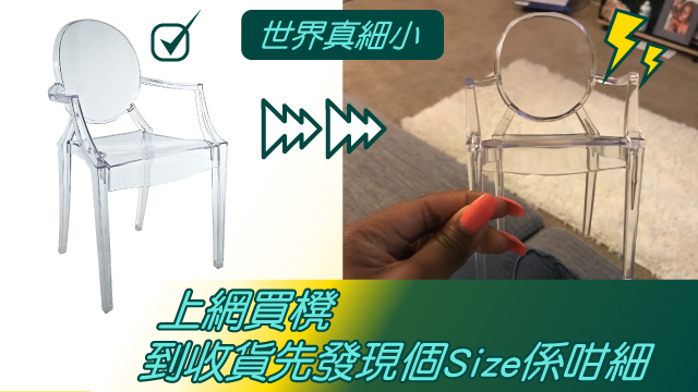 點知,到佢收貨嘅時候先發現⋯⋯點解張透明膠櫈個size細到咁都有嘅喂?明明網上張示範圖片係咁樣樣,張櫈拍埋落啲花樽同相架度都好似好大張咁㗎啵!你而家即係擺明呃9人啫!