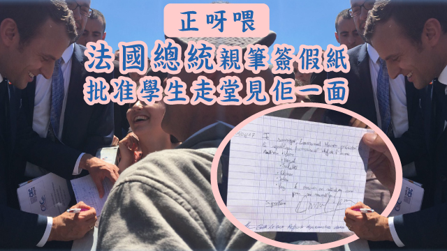 於是呢張假紙畀法國總統簽名加持之後,唔止P.E. 阿sir睇到都笑到嬲佢哋唔落,就連其他老師同學都爭住話要睇,最後學校仲影印咗張假紙,貼埋喺Office度同大家開心share?!走堂走到為校爭光,你哋係得嘅!