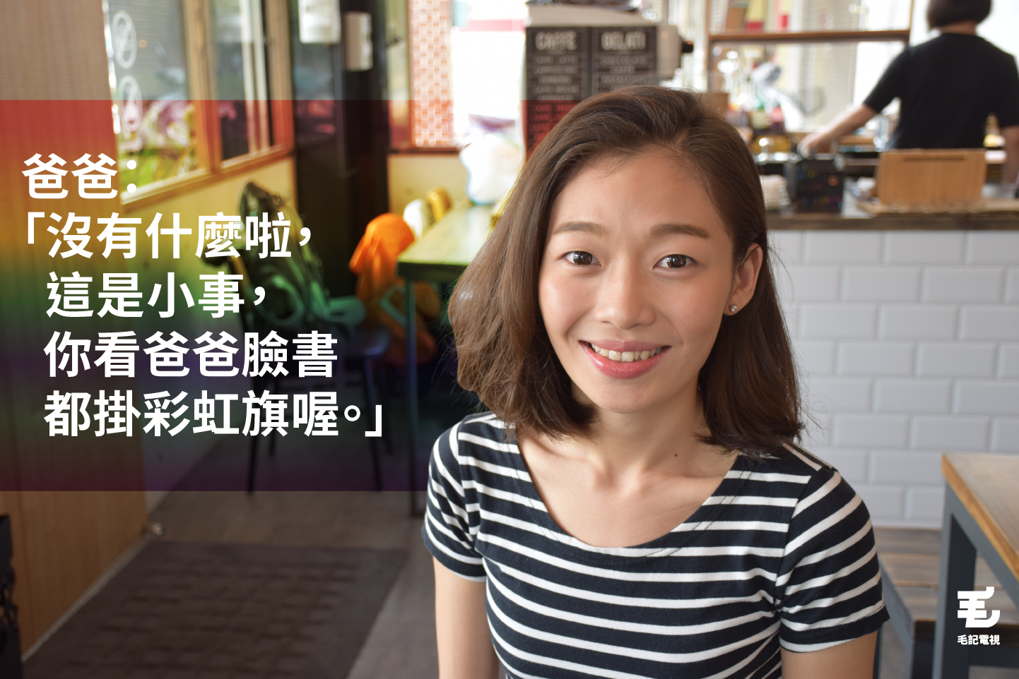 Ginny話真正同爸爸坦白,係喺佢哋單獨飲酒傾偈嘅時候。爸爸講笑咁講:「你交了兩個男朋友,還是三個?」 Ginny靜靜咁答佢:「不是男朋友,是女朋友啦。」嗰一刻,爸爸好似定咗鏡咁,隔幾秒先話:「沒有什麼啦!這是小事,你看爸爸臉書都掛彩虹旗(LGBTQ平權運動的符號)喔。」但其實爸爸喺一開始知道女兒係同性戀嘅時候,內心有好大嘅掙扎,例如唔知要點面對阿女嘅女朋友,唔知可唔可以將阿女嘅女朋友當成自己個女等等。不過呢一切都係初頭嘅事,Ginny話佢哋而家相處得好好,仲會一齊食飯傾偈?!