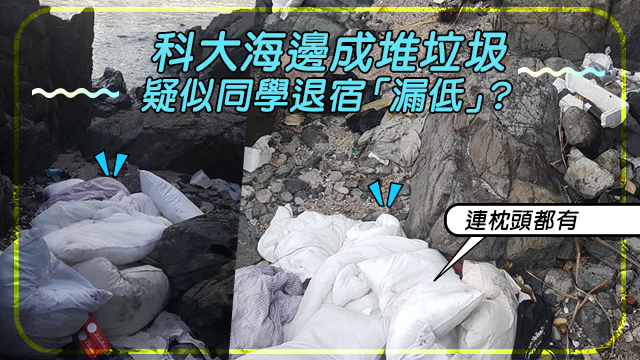 今朝早有位科大同學仔輝輝喺科大海邊發現大量日用品,包括枕頭呀、燒烤用品呀、毛毯呀咁,而呢排又係退宿嘅日子,所以就懷疑係有大頭蝦嘅同學唔小心漏低喺海邊喇……嗱,毛毛話佢哋疑似漏低咋,冇話佢哋係因為唔想搬返屋企而特登亂掉㗎!