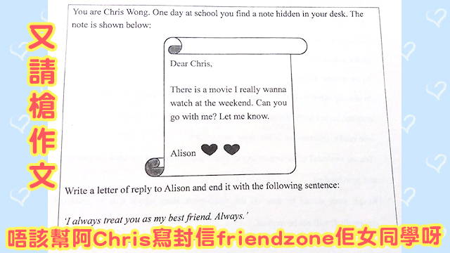 話說,最近阿Chris就收到封女同學Alison寫畀佢嘅信喇!信入面講到Alison有套戲想睇,就問阿Chris哥可唔可以weekend陪佢去睇喇。呢個年代,仲寫信約人嘅女仔買少見少喇,不過好女仔咁又點吖? 中學生不應談戀愛,加上呢個Alison喺簽名隔籬加咗兩個心心,擺明有嘢,Chris就決定回信,用「I always treat you as my best friend. Always.」呢句句子做封信嘅結尾,講清楚自己自己只係當佢係朋友喇!當然,呢封信都係請槍㗎啦!